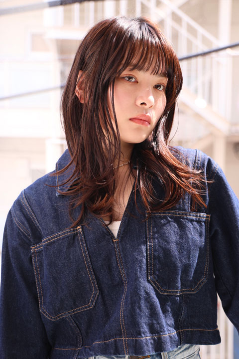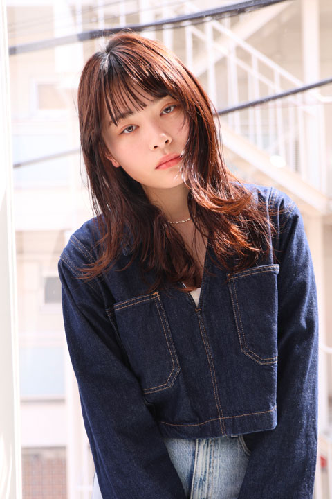 くせ毛風外ハネカールでリラクシーなミディアムレイヤー/ルーズ/抜け感/シースルーバング/透けバング/ぱっつん前髪/オン眉/ルーズ/フレンチカジュアル/アプリコットオレンジ/ワインレッド/チェリーレッド/艶髪/細めハイライト/フェイスフレーミング/小顔